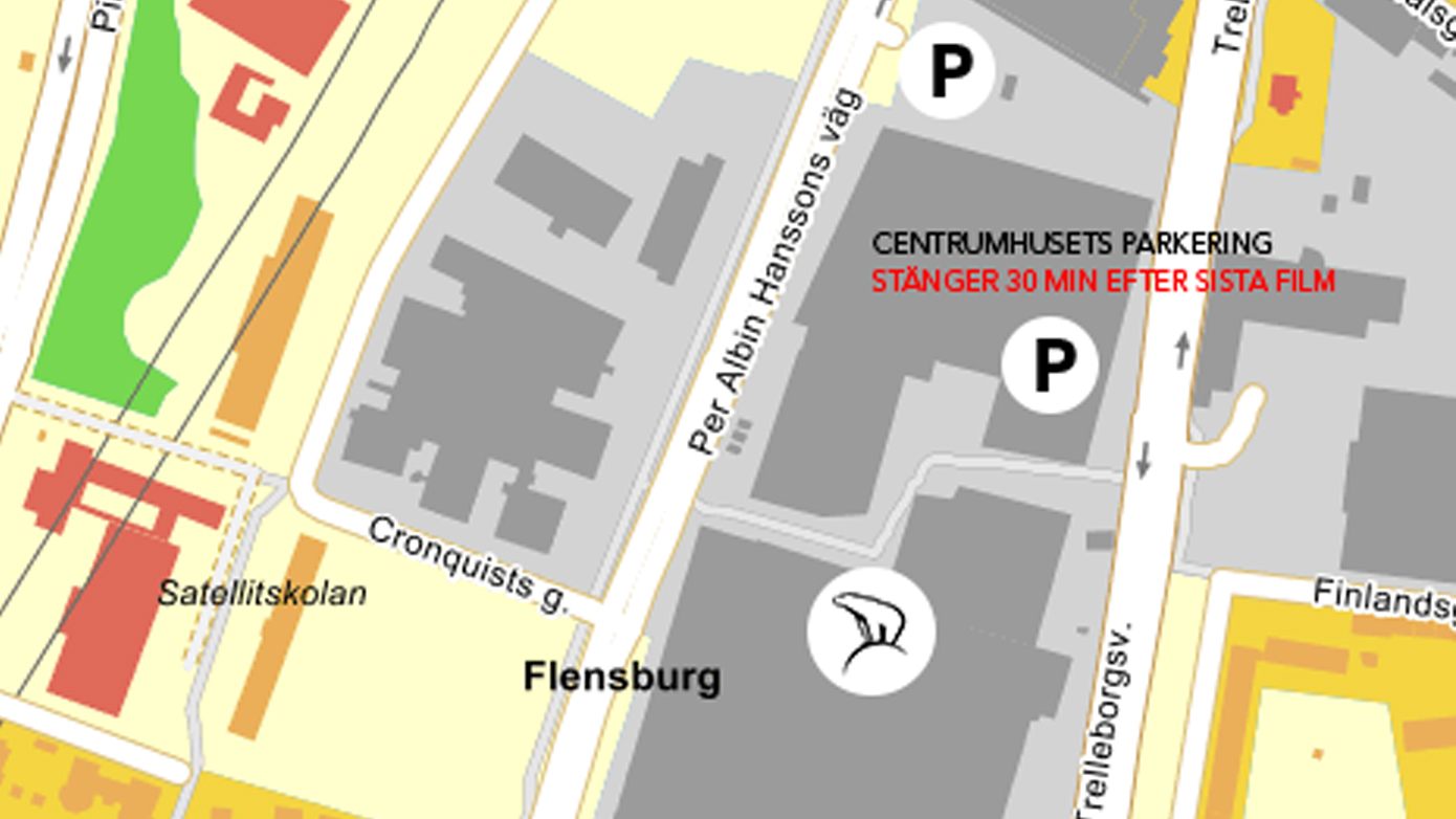 Centrumhusets p-hus och garage ligger vid Willys med infart från Trelleborgsvägen och följer biografens öppettider - det stänger alltid 30 minuter efter sista filmen är slut. Så om du parkerar här är det ingen risk att din bil blir inlåst. Välj detta om du ska gå på en senare visning.