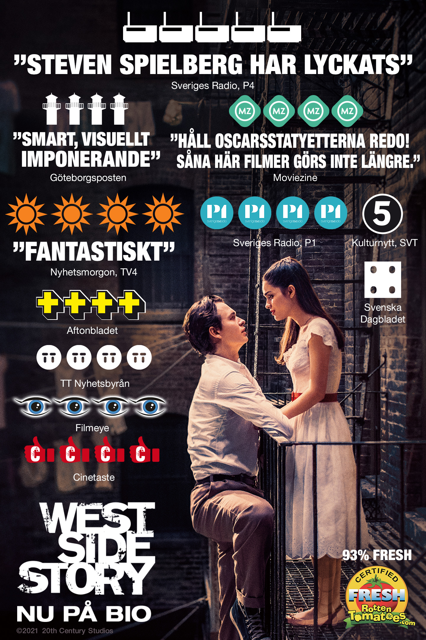 WEST SIDE STORY är baserad på den framgångsrika Broadway-musikalen från 1957 och är en berättelse om ungdomlig kärlek och gängrivalitet i 50-talets New York. I rollerna ser vi bland andra Ansel Elgort (Tony), Rachel Zegler (Maria), Ana Isabelle (Rosalia), Corey Stoll (Lieutenant Schrank), Brian d'Arcy (Officer Krupke), Curtiss Cook (Abe) och Oscarbelönade Rita Moreno som Valentina.