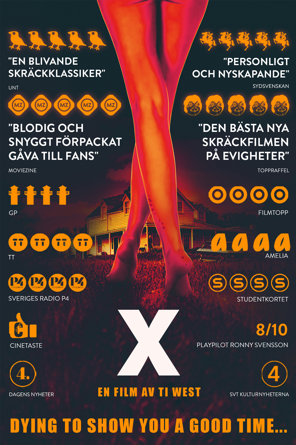 Ett filmteam hyr in sig på en avlägsen gård i Texas för att ostört kunna spela in en vuxenfilm som de hoppas ska göra dem både rika och berömda. Det äldre paret de hyr huset av visar sig ha en egen agenda och börjar snart terrorisera sina hyresgäster. Kid Cudi, Jenna Ortega, Brittany Snow och Mia Goth slåss för sina liv i denna skräckfilm med coola sjuttiotalsvibbar, producerad v A24 som gjorde Midsommar, Hereditary och It Comes at Night.?